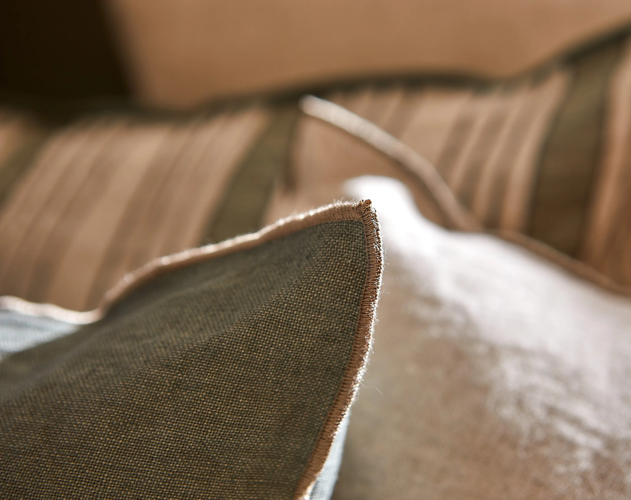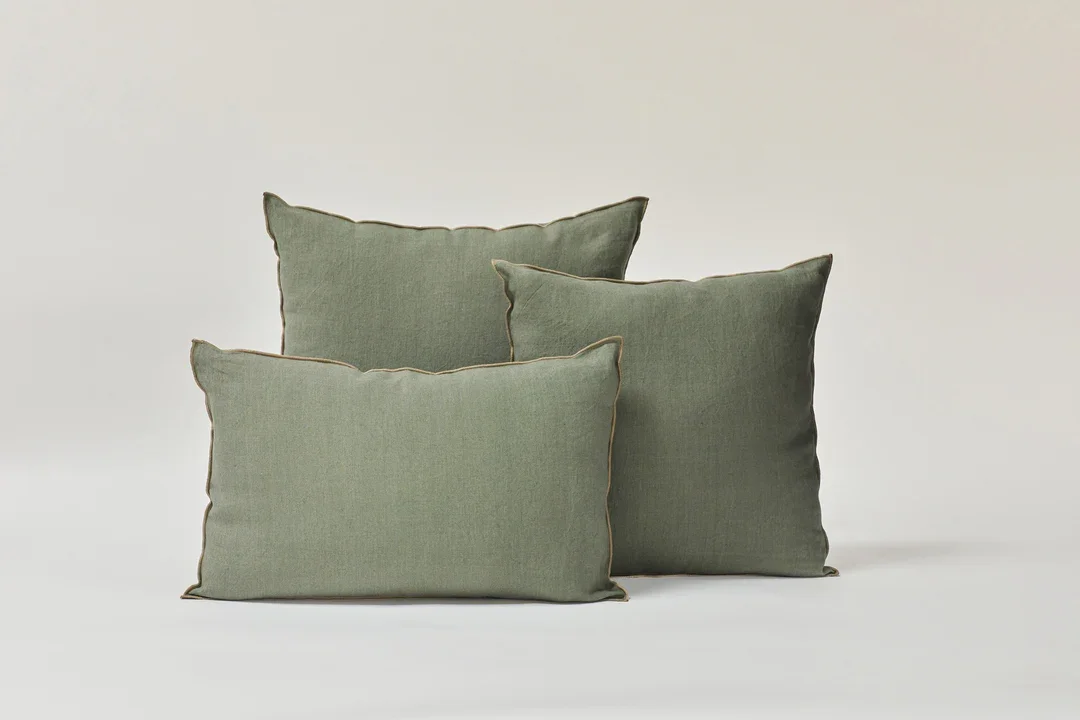 Bonitos cojines en lino lavado con un vivo cosido en otro lino haciendo contraste.