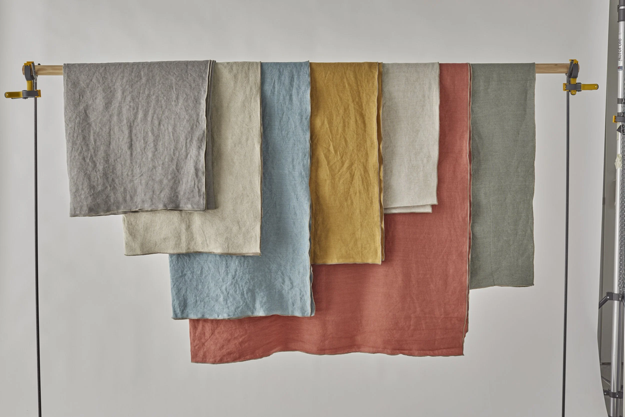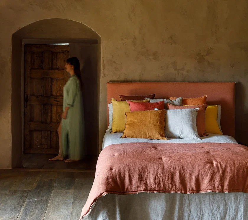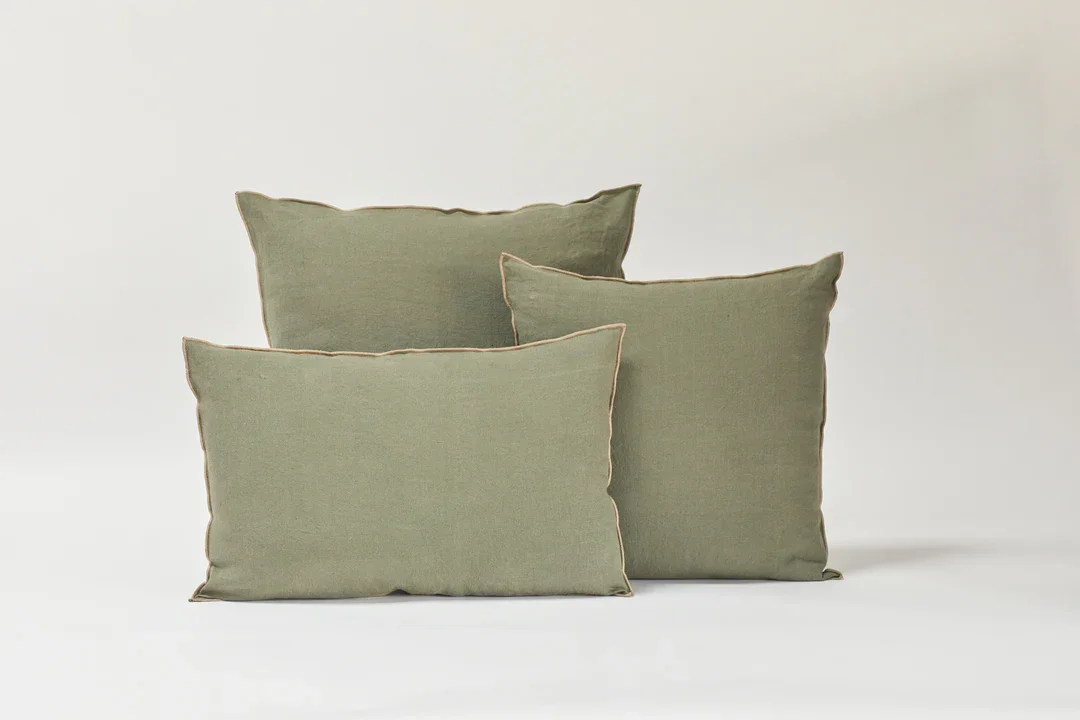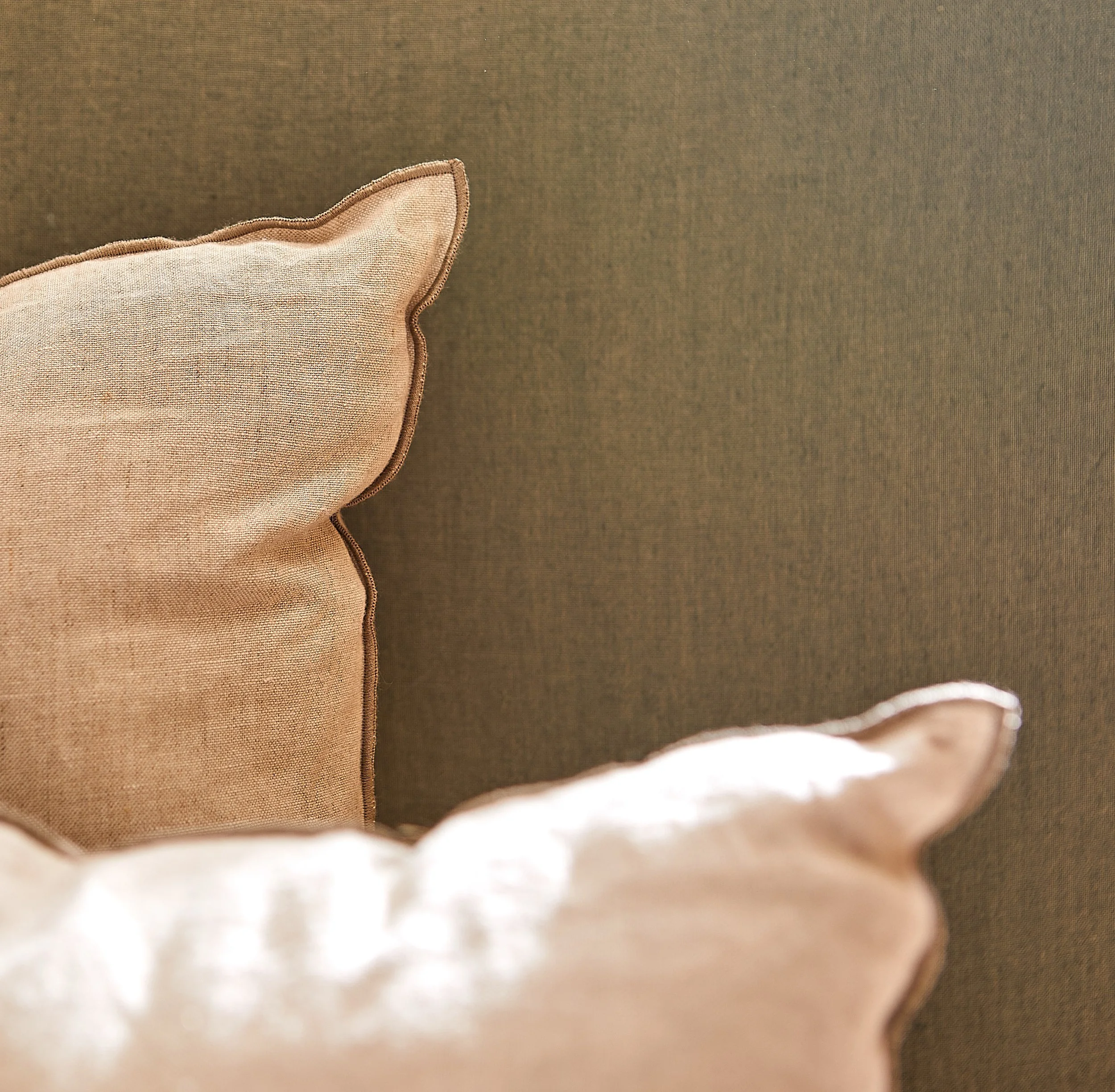 Bonitos cojines en lino lavado con un vivo cosido en otro lino haciendo contraste.